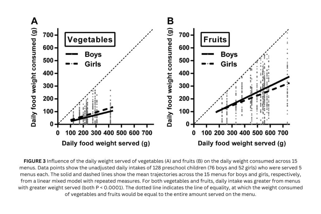 Roe LS, Keller KL, Rolls BJ. Food properties and individual characteristics influence children’s intake across multiple days of weighed assessments in childcare programs. Journal of Nutrition, Volume 153, Issue 5, May 2023, Pages 1646-1655, doi.org/10.1016/j.tjnut.2023.03.025.