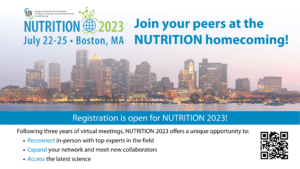 Registration for NUTRITION 2023 is open! Reconnect with the nutrition community in Boston, MA, July 22-25, 2023, for the premier nutrition science meeting. Once you register, you will have access to reserve housing within ASN’s official hotel block. For the best rates and selection, register early.
